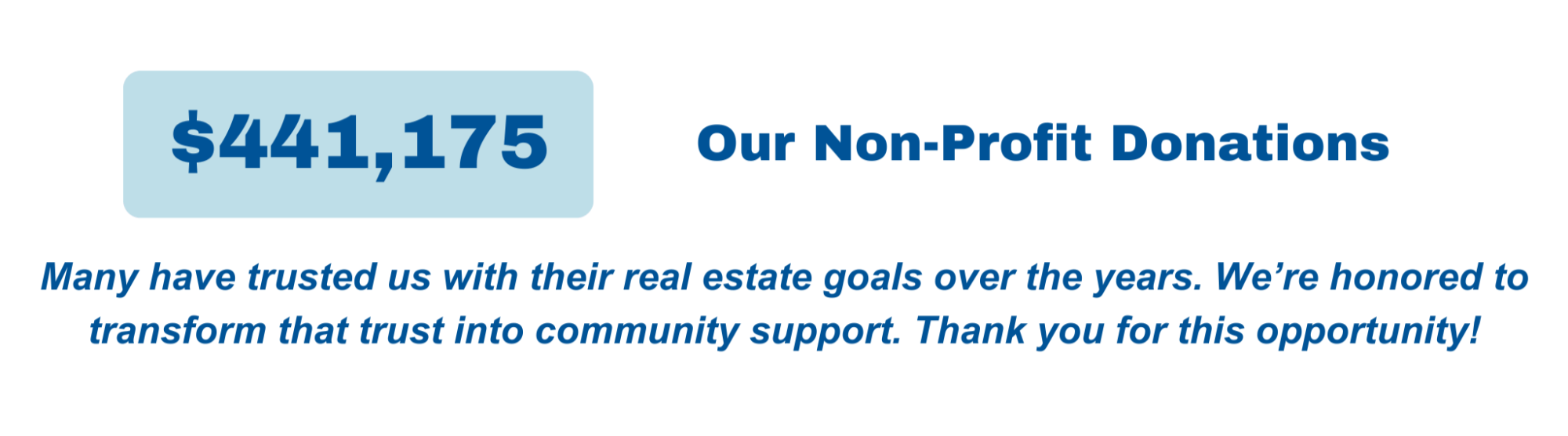 When we set our first goal of donating $200,000 to local causes, we reached it by June 8, 2021. By July 25, 2022, we had passed the $300,000 milestone. As of April 22, 2025, we’re proud to share that Pfeifer Realty Group has donated $422,175 to nonprofits in our community, and we’re not slowing down.